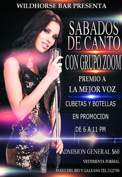 Este sabado 11 de abril es sabado de canto con el mejor grupo Zoom con un gran premio a la mejor voz ven a divertirte y a pasar una gran noche desde las 6.00 pm admisión general $60.00 en el mejor lugar Wildhorse Palominos en Hermosillo